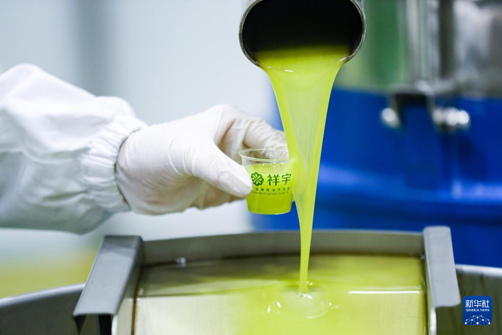 在陇南市武都区一家油橄榄加工企业,工作人员用小杯接取初榨橄榄油(10月31日摄)。