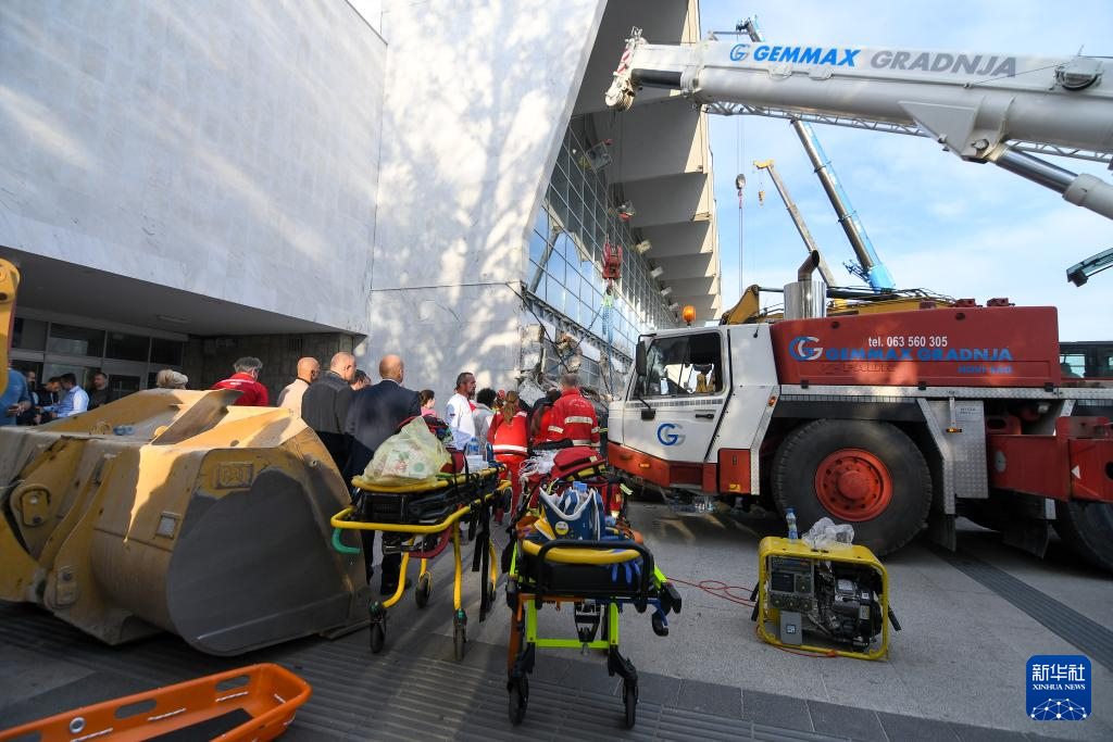 11月1日,在塞尔维亚中北部城市诺维萨德,救援人员在火车站雨棚倒塌事故现场工作。