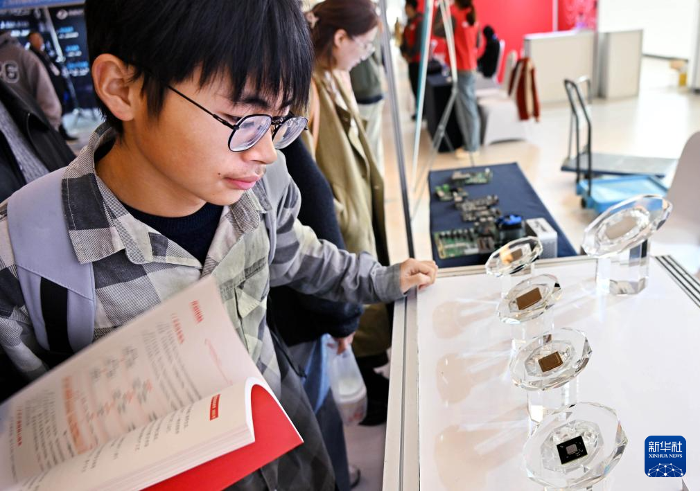 11月2日,一名与会者在2024中国自动化大会展览区观看国产芯片。