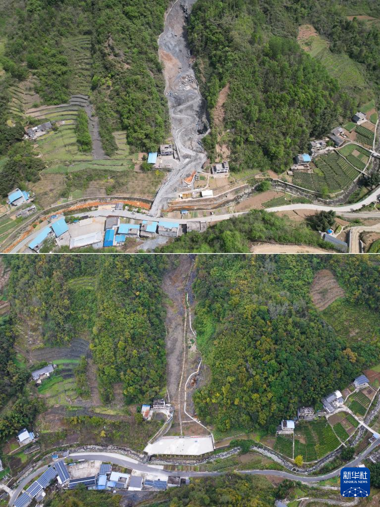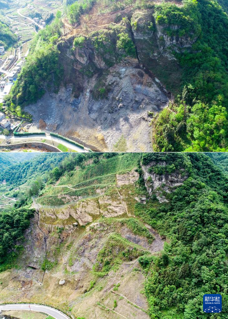 拼版照片:上图为2022年4月9日拍摄的白河县卡子镇凤凰村一处治理施工中的废弃矿点(无人机照片);下图为2024年10月21日拍摄的同一地点完成治理后的面貌(无人机照片)。