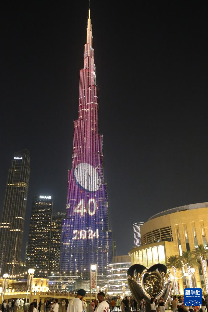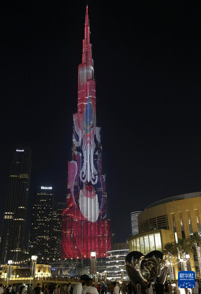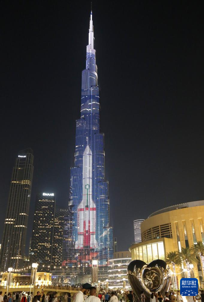 11月1日,阿联酋迪拜哈利法塔上演灯光秀,以“友谊四十载 未来更可期”为主题,展示中国与阿联酋建交40年来在科技、航天、文化、旅游等领域的友好合作。