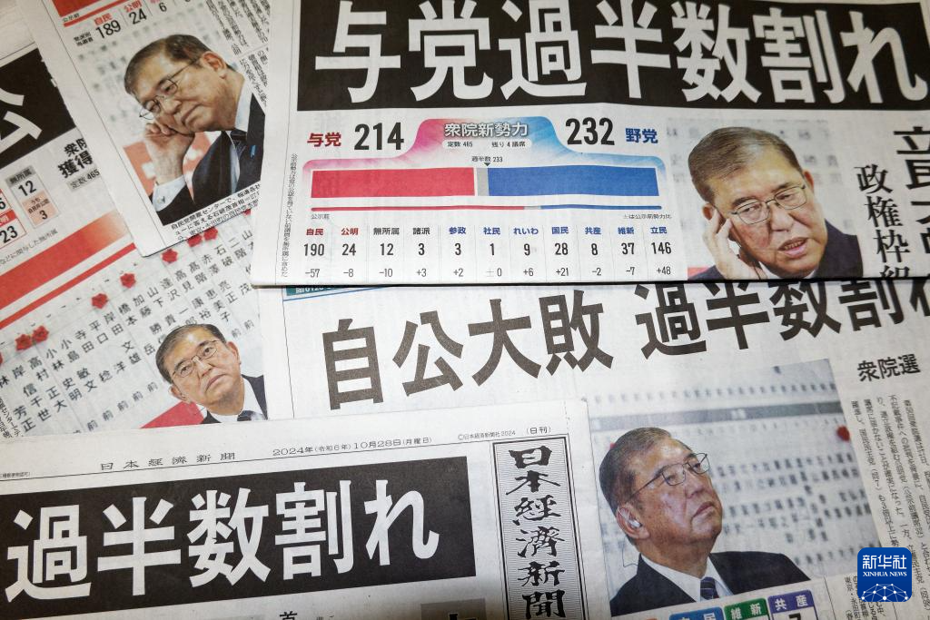 据日本广播协会28日凌晨报道,日本自民党和公明党组成的执政联盟在27日举行的日本第50届众议院选举中,未能获得过半数议席。日本首相、自民党总裁石破茂当地时间28日14时在自民党总部召开记者会,就执政联盟在众议院选举中败北表示诚挚接受选举结果,将继续进行政治改革。