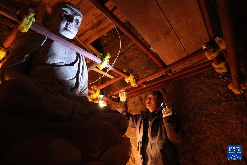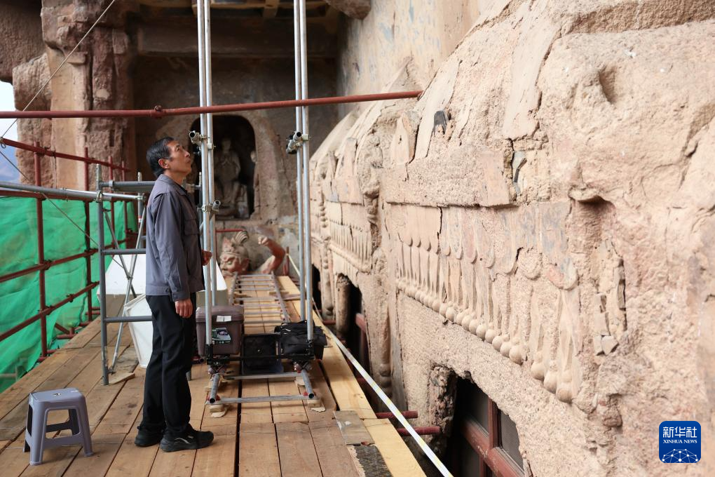 麦积山石窟艺术研究所数字中心主任董广强在查看麦积山石窟的壁画雕塑(11月2日摄)。