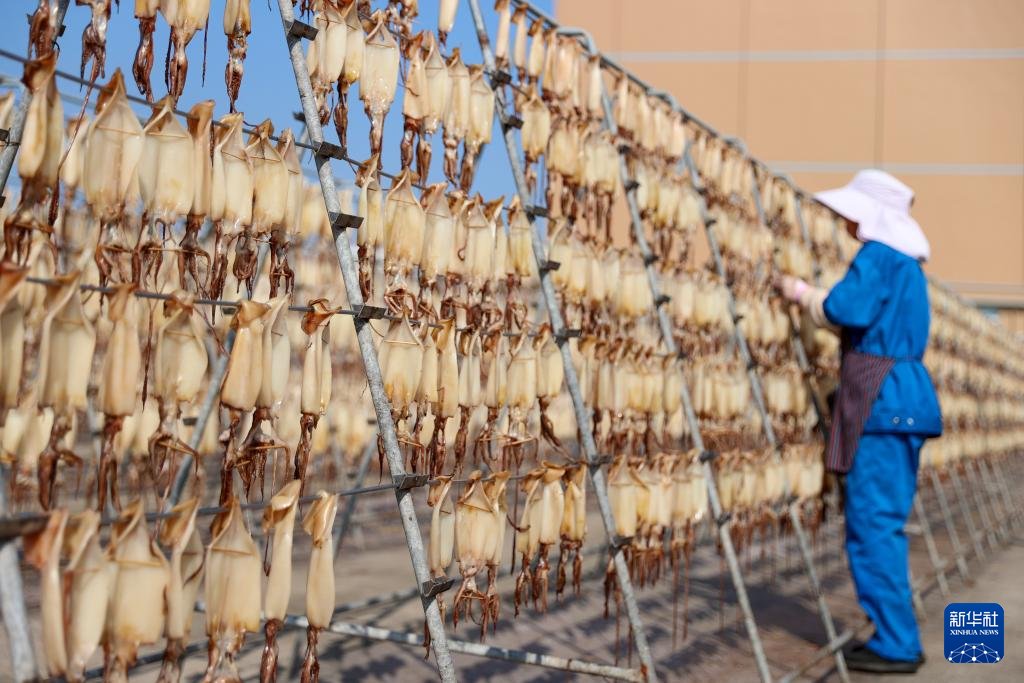 11月3日,在浙江省舟山市普陀区展茅工业园一水产食品加工企业晒场,工人忙着晾晒鱿鱼鲞。