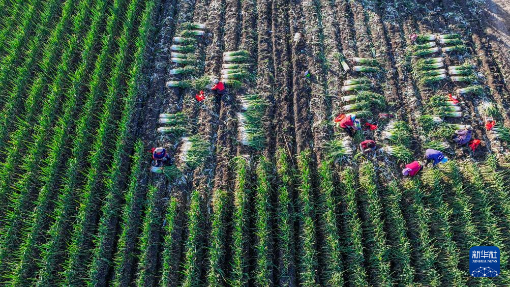 11月3日,河北省玉田县彩亭桥镇农民在收获大葱(无人机照片)。