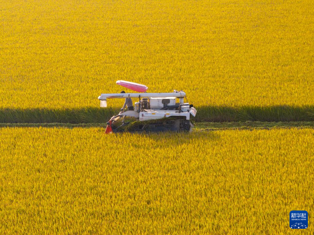 11月3日,农民驾驶农机在江苏省兴化市周庄镇西浒村收割水稻(无人机照片)。