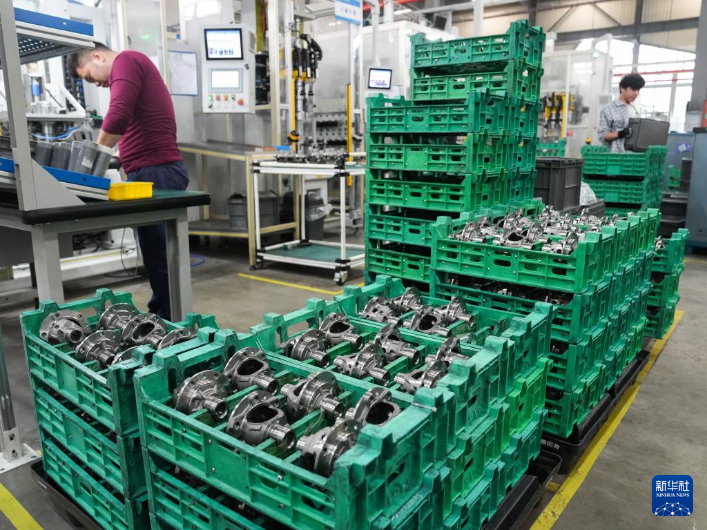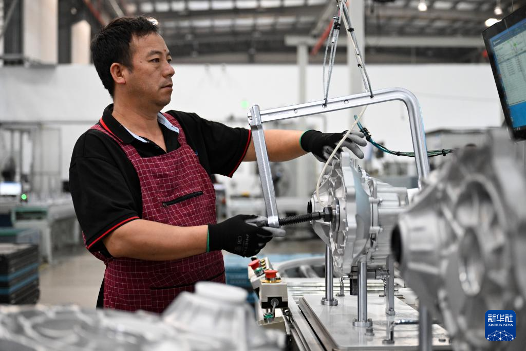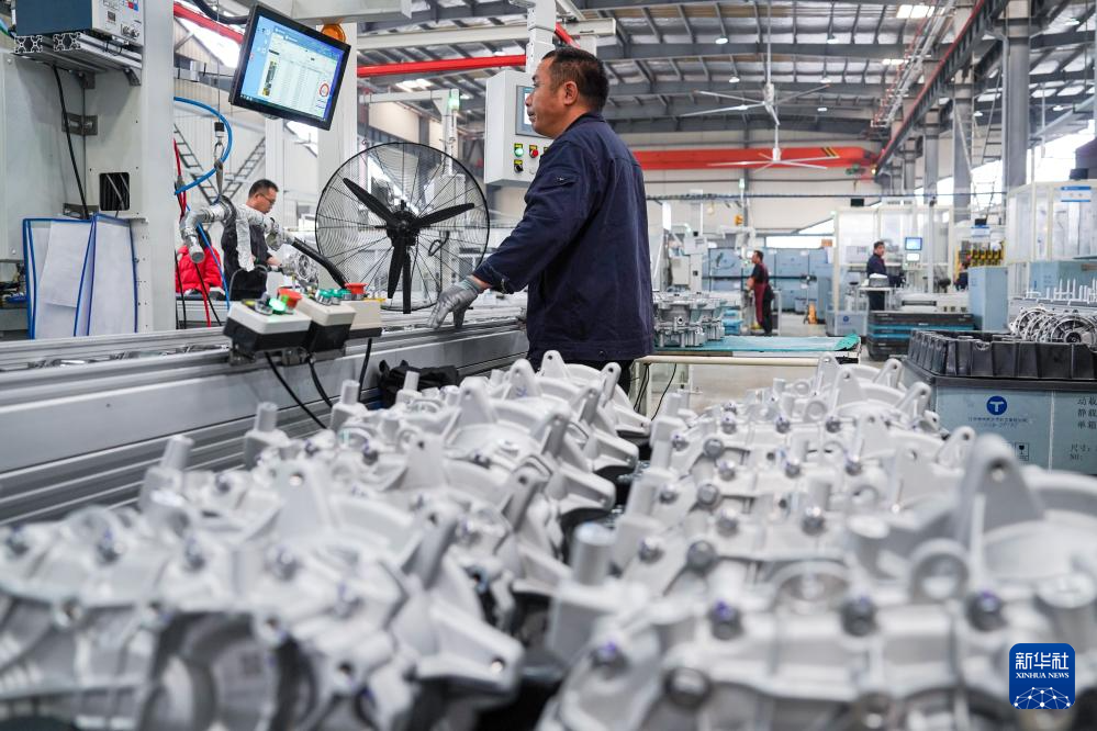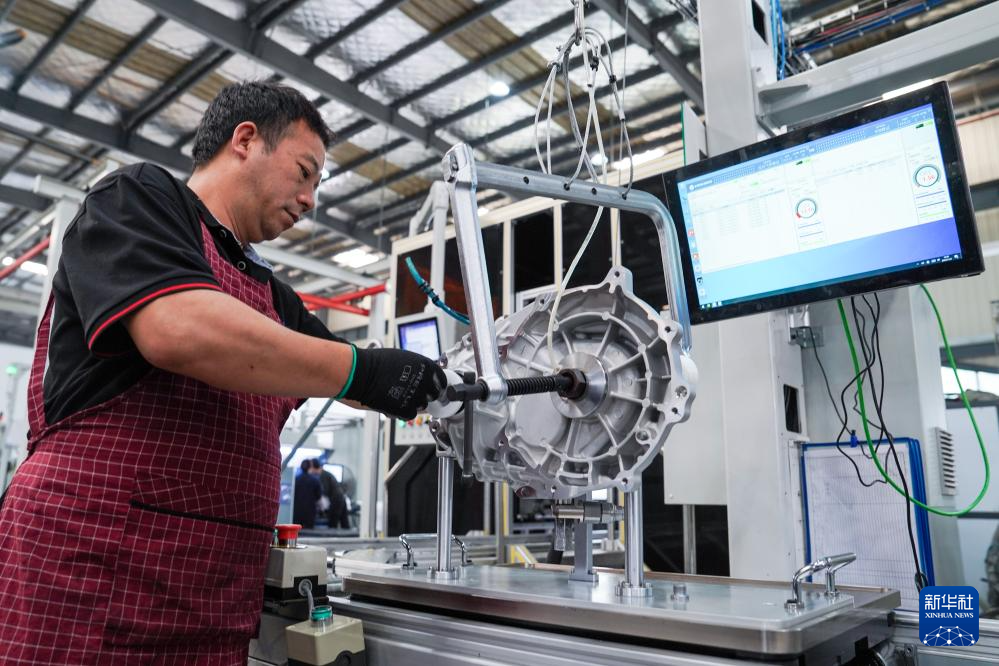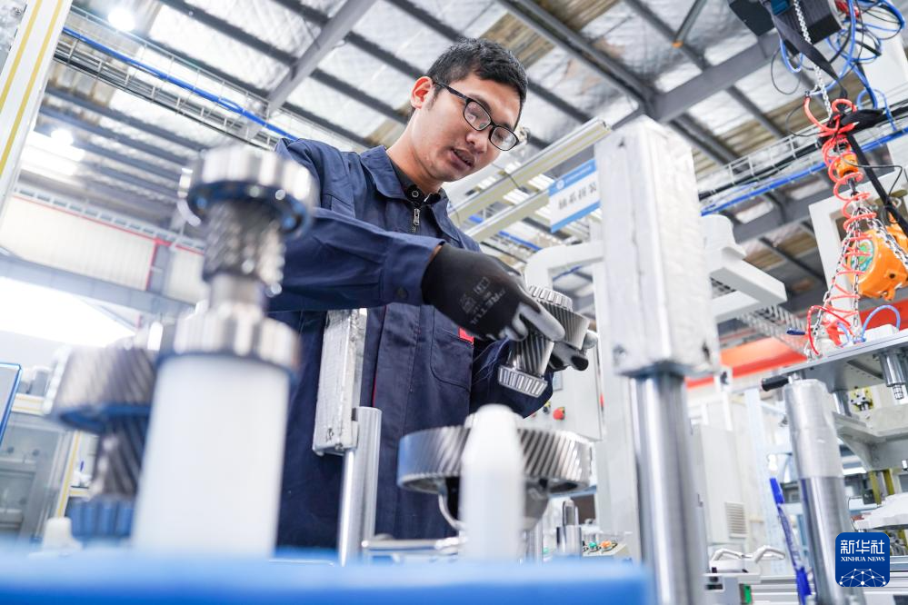 在位于江苏南通如东经济开发区的江苏御传新能源科技有限公司,工人在生产车间内装配新能源汽车传动系统零件(11月2日摄)。