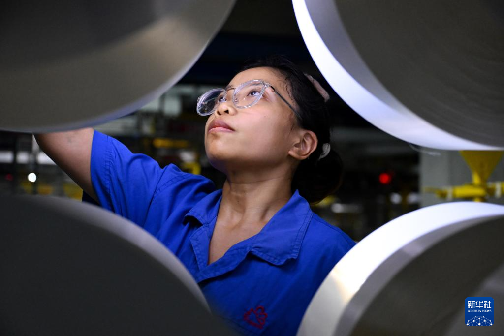 11月1日,工人在昆桐集团江苏嘉通能源有限公司聚酯纤维车间内检查产品。