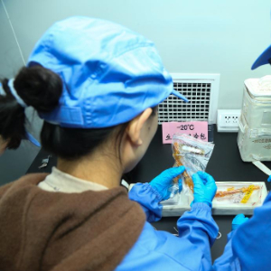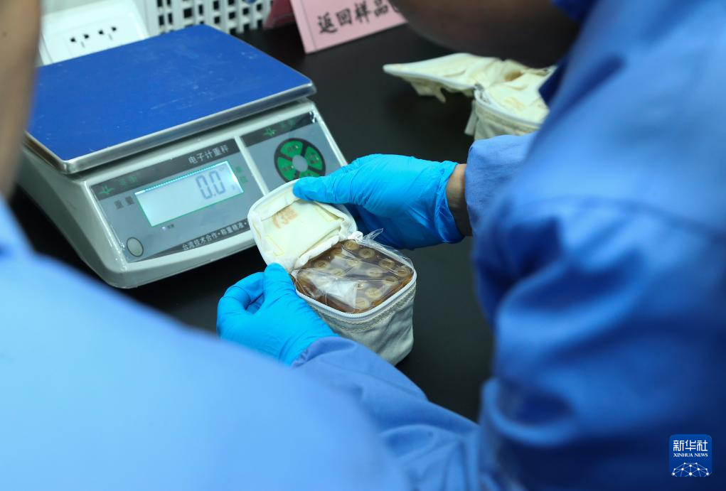 11月4日,在位于北京的中国科学院空间应用工程与技术中心,工作人员检查返回实验样品的状态。