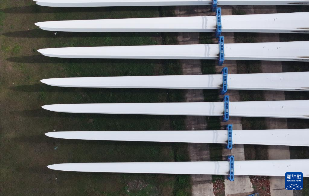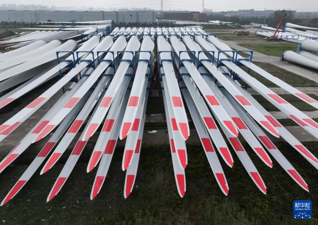 这是11月2日在重通成飞风电设备江苏有限公司拍摄的风力发电机组叶片(无人机照片)。