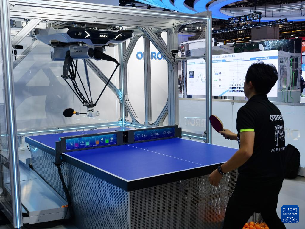 11月5日在第七届进博会技术装备展区拍摄的欧姆龙乒乓球机器人。