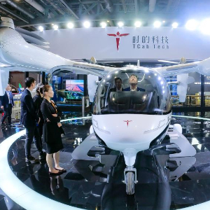 11月5日,观众在第七届进博会汽车展区参观一台电动垂直起降飞行器模型。