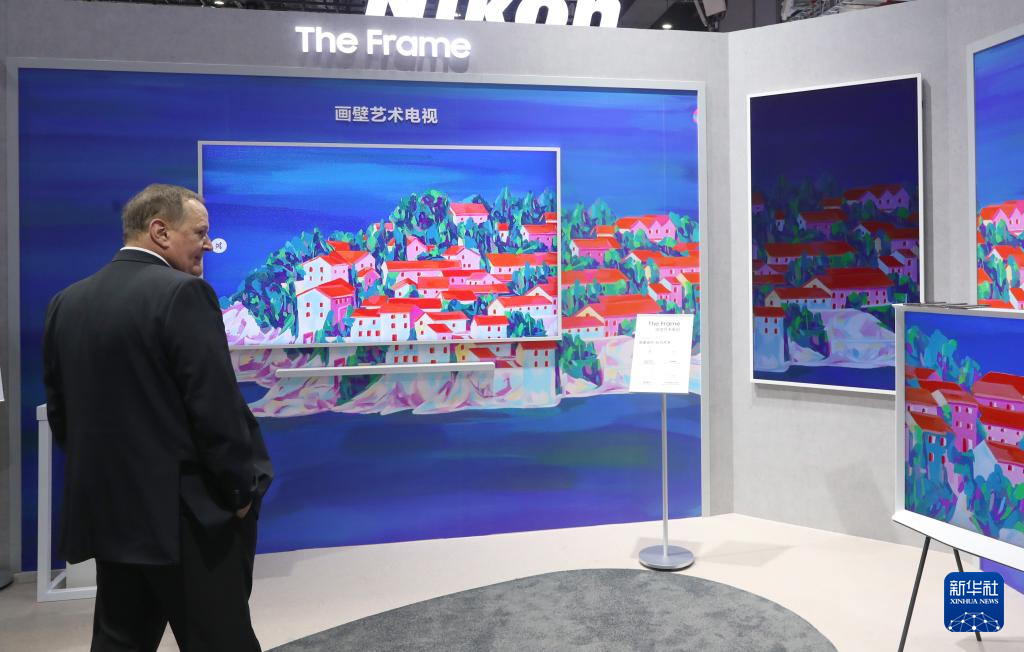 11月5日,参会者在第七届进博会技术装备展区三星公司一组画壁艺术电视展品前驻足观看。