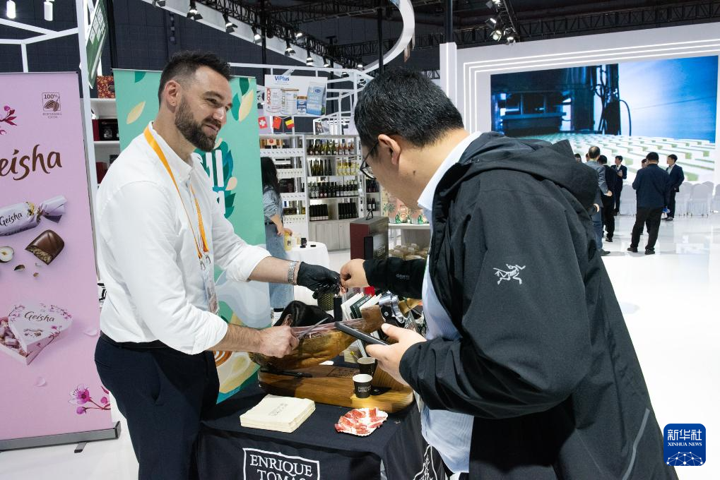 11月5日,参展商(左)在第七届进博会食品及农产品展区介绍西班牙火腿。