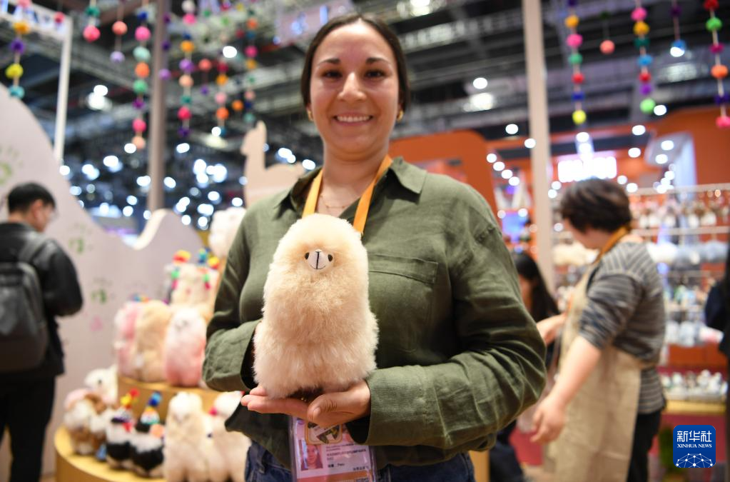 11月5日,参展商在第七届进博会消费品展区秘鲁温暖驼展台展示羊驼玩偶。