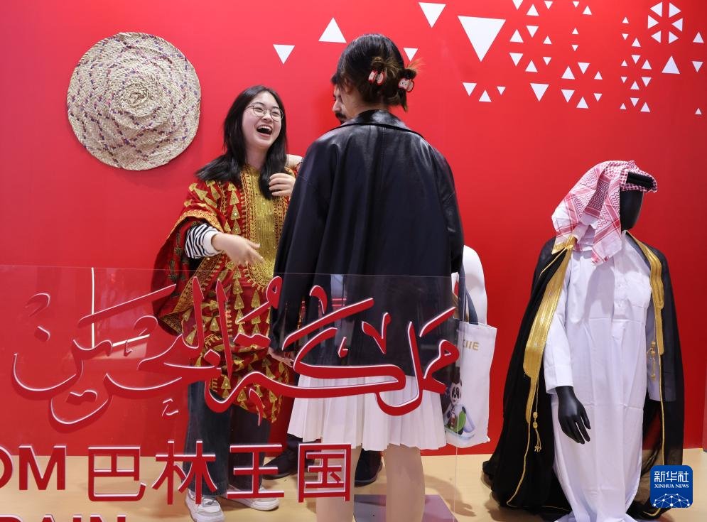 11月5日,参会者在第七届进博会国家展巴林馆试穿巴林服装。