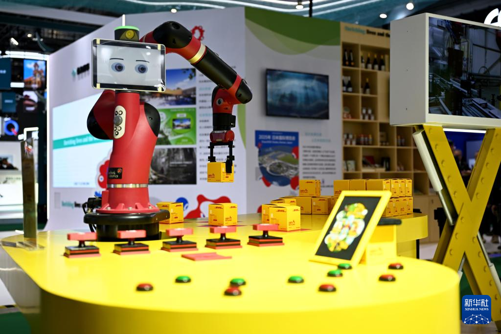 11月5日在第七届进博会服务贸易展区DHL(敦豪)展台拍摄的分拣机械臂。