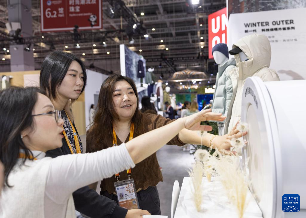 11月5日,人们在第七届进博会消费品展区优衣库展台体验冰雪羽绒防风面料。