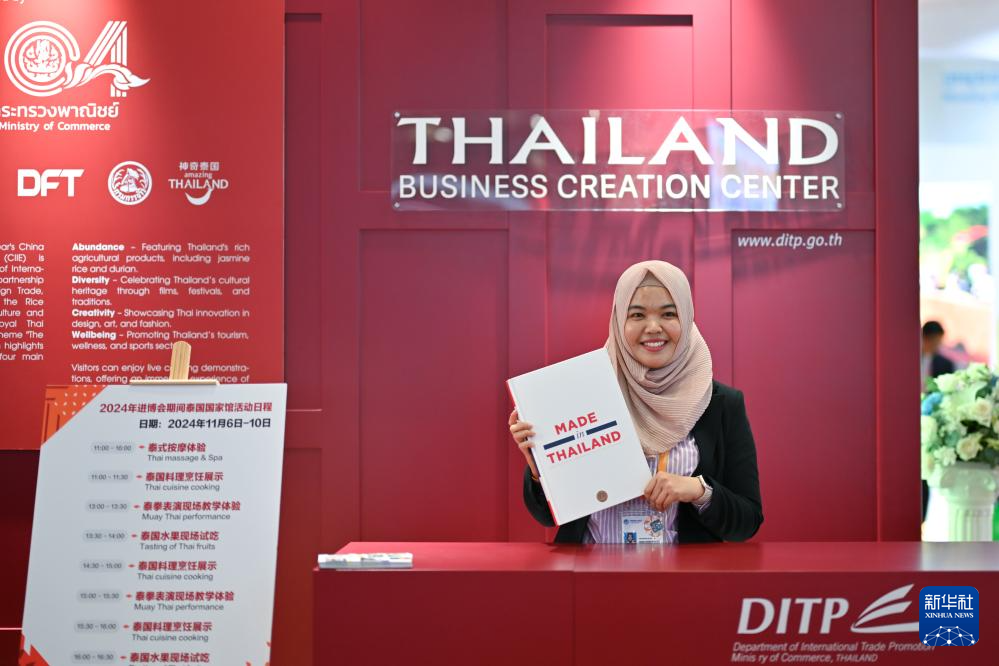 11月5日,工作人员在第七届进博会国家展泰国馆留影。