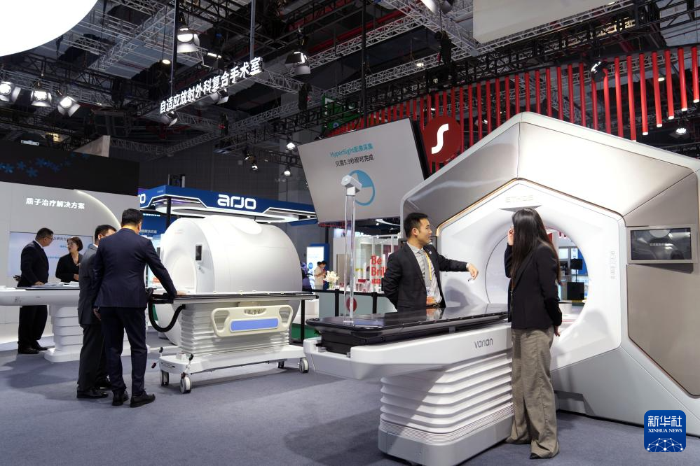 11月5日在第七届进博会医疗器械及医药保健展区瓦里安医疗站台拍摄的自适应放射外科复合手术室。