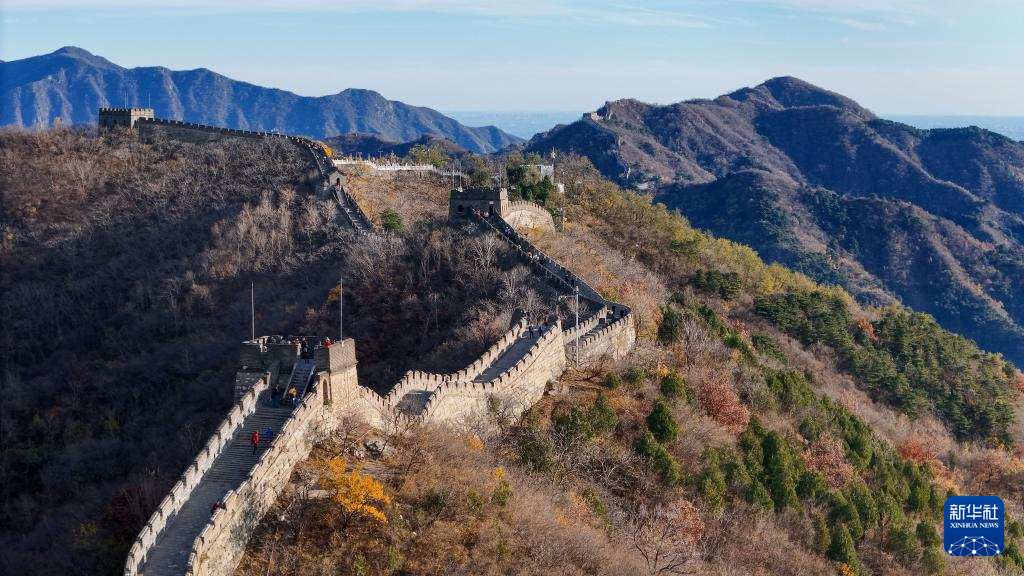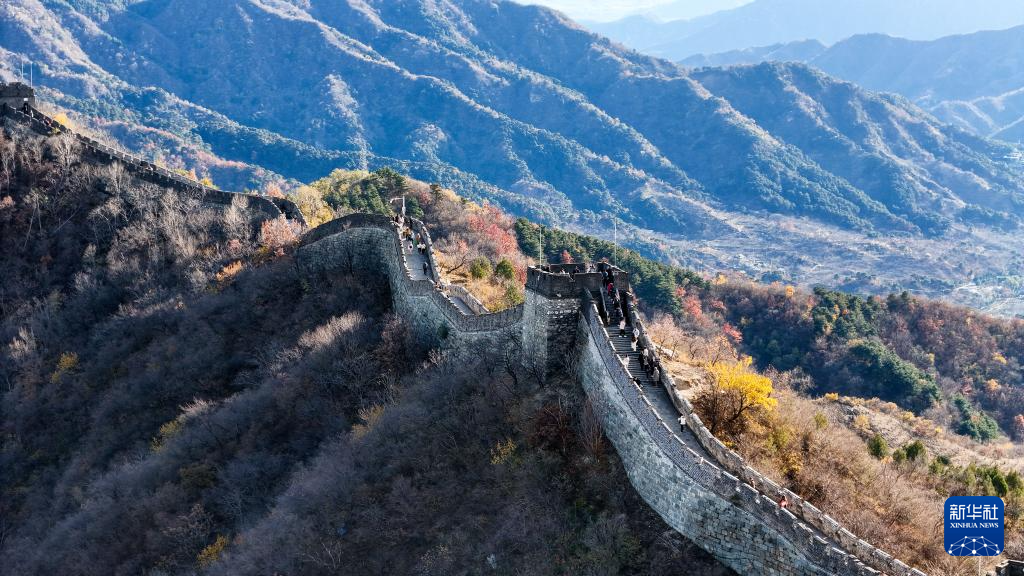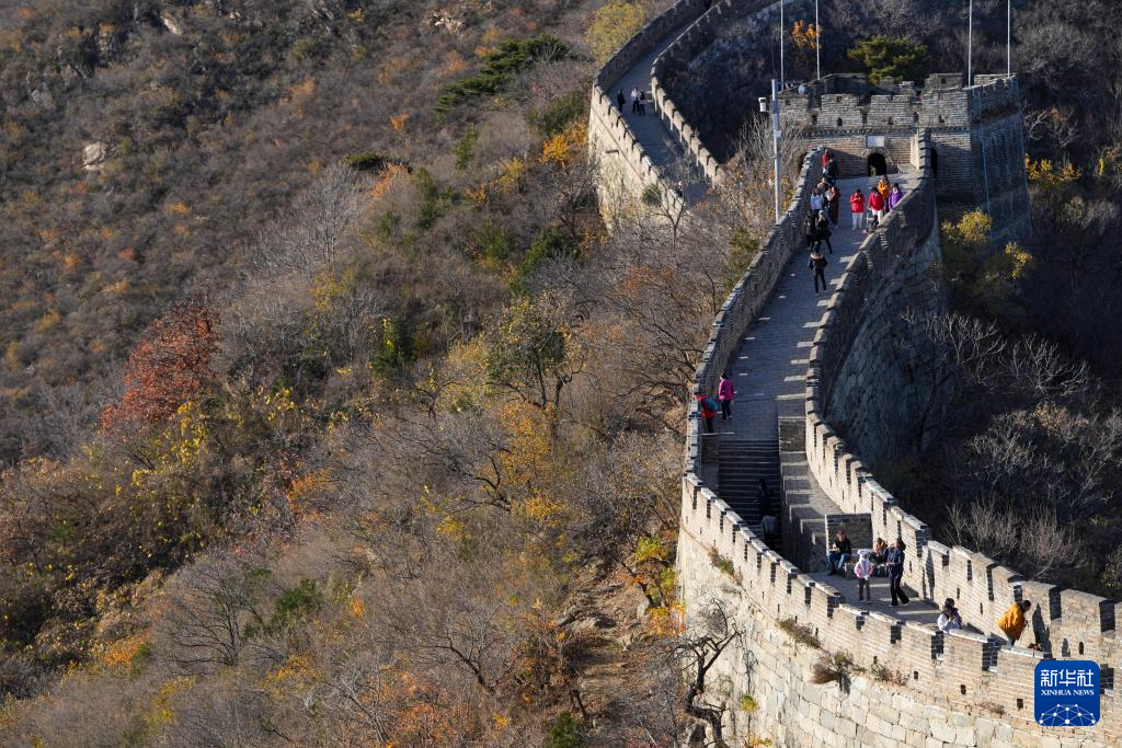 11月4日,游客在慕田峪长城游览(无人机照片)。