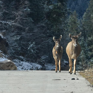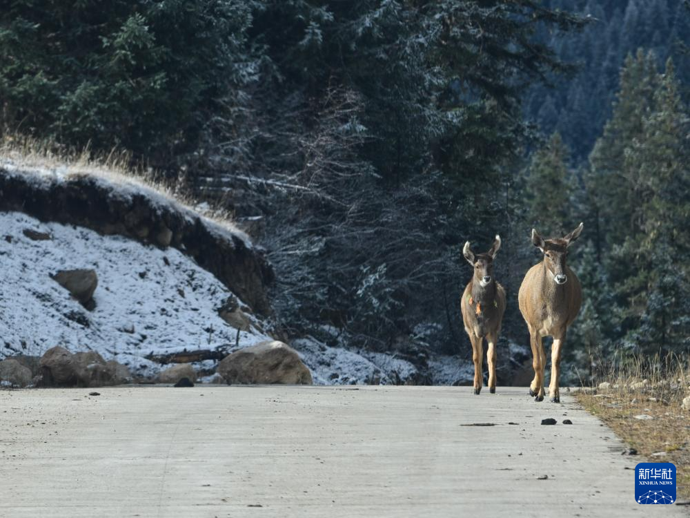 这是11月4日在多瀑沟景区拍摄的2只国家一级保护动物白唇鹿。