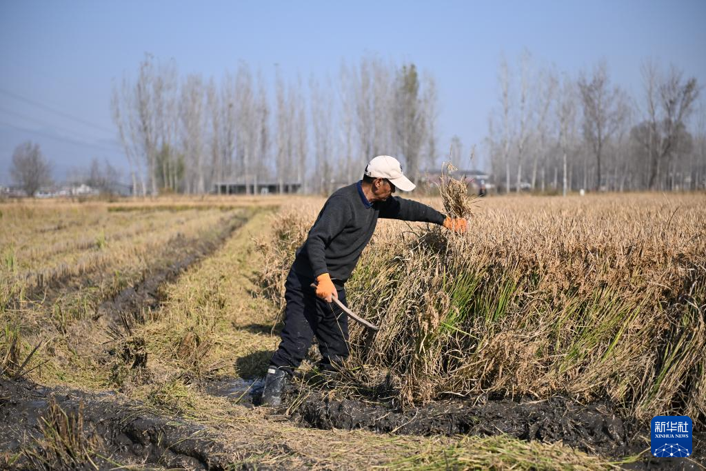 11月6日,涿州金穗农业种植专业合作社的农民在涿州市百尺竿镇西豆家庄村稻田里忙碌。