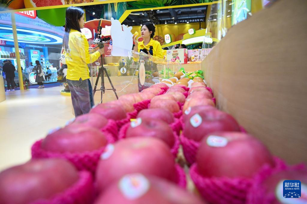 11月6日,参展商在第七届进博会食品及农产品展区通过在线直播介绍水果产品。