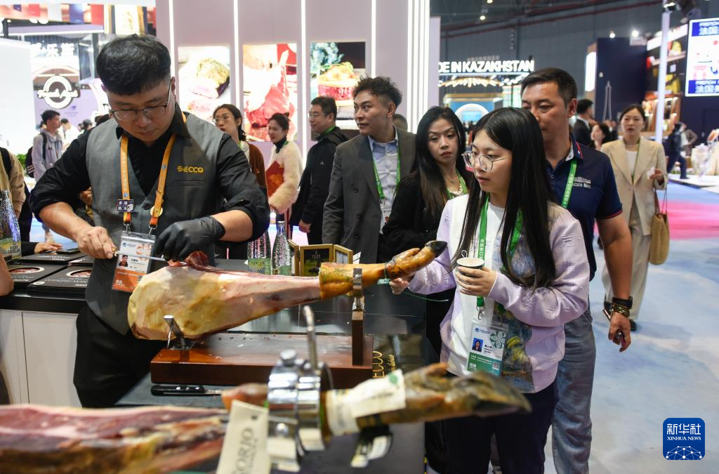 11月6日,参会者在第七届进博会食品及农产品展区卡斯特展台品尝西班牙火腿。