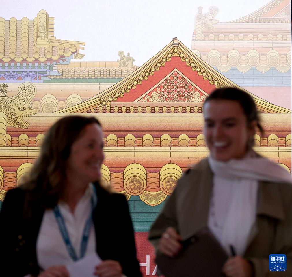 11月5日,在英国伦敦,两名女子在伦敦世界旅游交易会中国展区参观。
