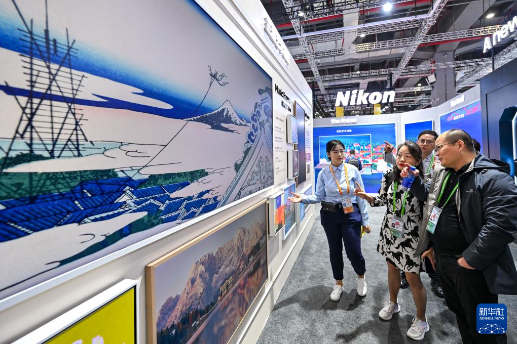 11月6日,观众在第七届进博会技术装备展区尼康展台体验摄影设备。