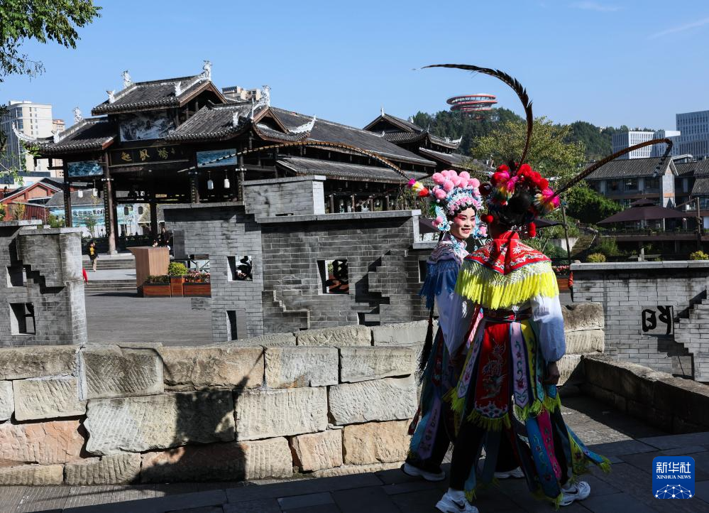 11月5日,两名川剧演员在恩阳古镇准备演出。