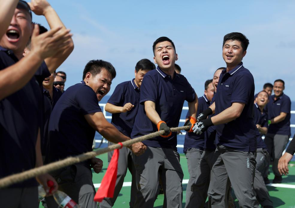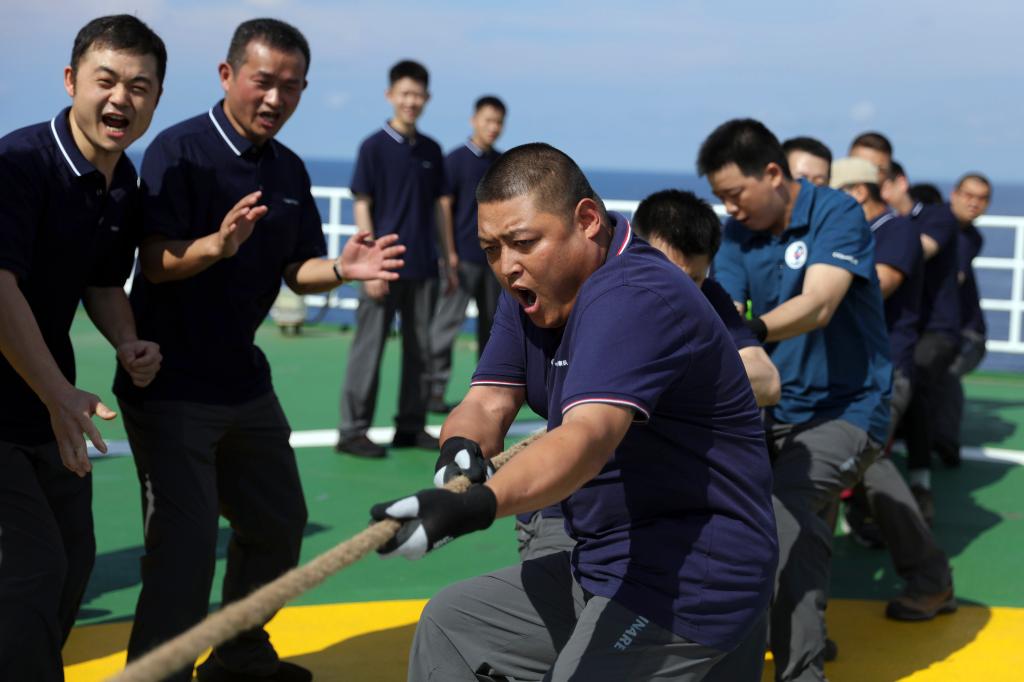 这是考察队队员在“雪龙2”号上参加拔河活动。