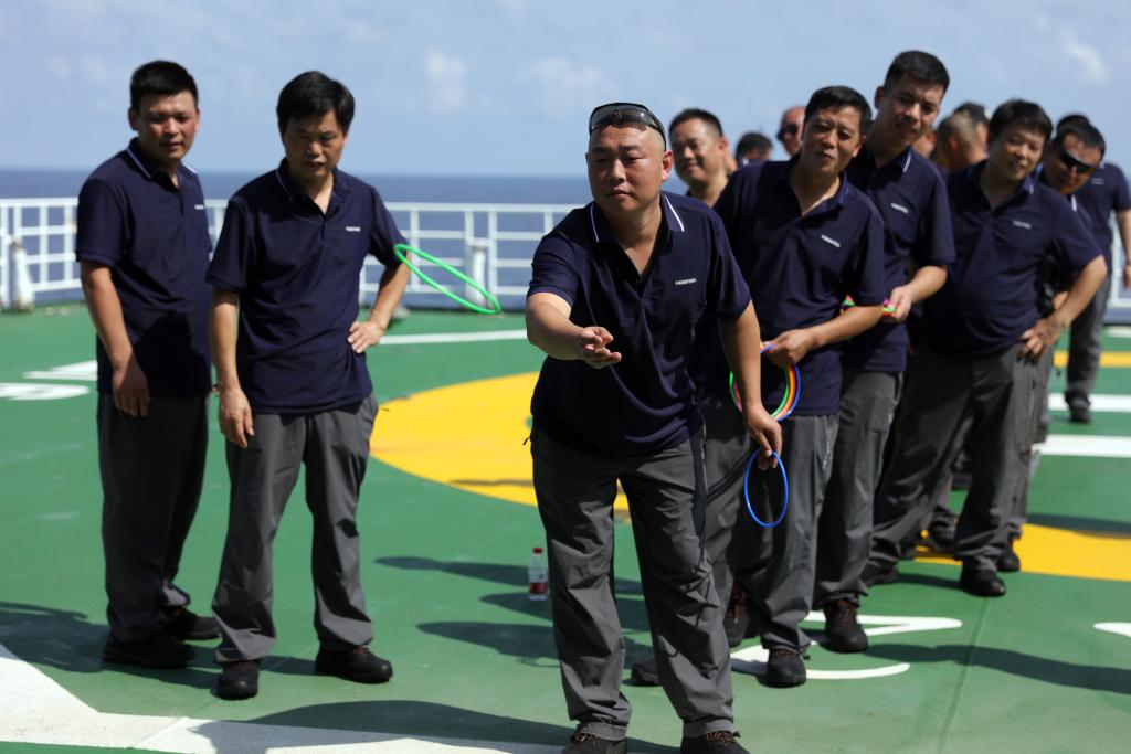这是考察队队员在“雪龙2”号上参加趣味套圈活动。