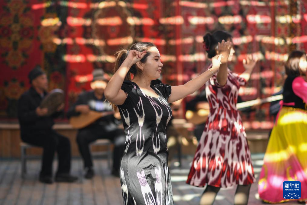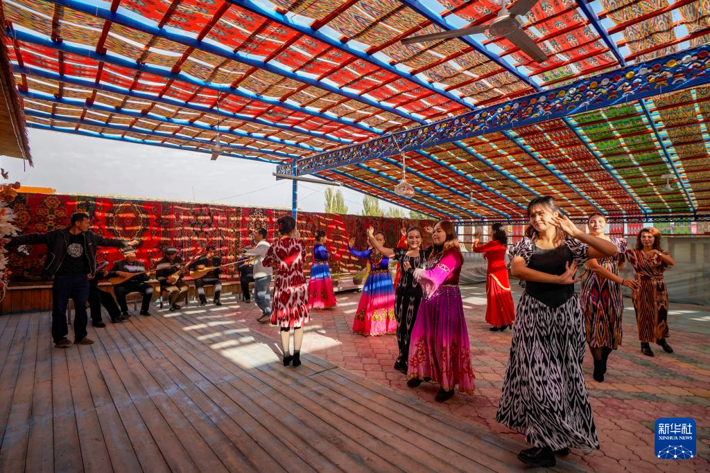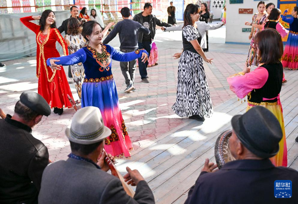 在加依村的一处小院,努尔东·司马义(右一)和几位村民弹奏乐曲,人们踏着节拍欢快起舞(10月30日摄)。
