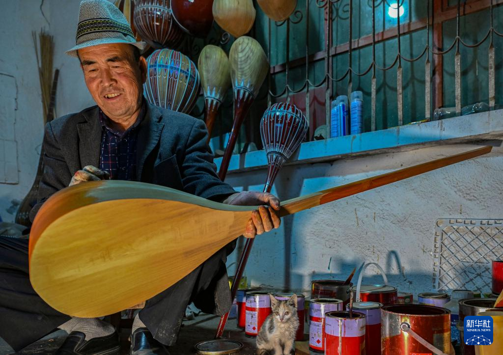 努尔东·司马义在家中给一把都塔尔刷漆,他养的小猫陪在身边(10月29日摄)。