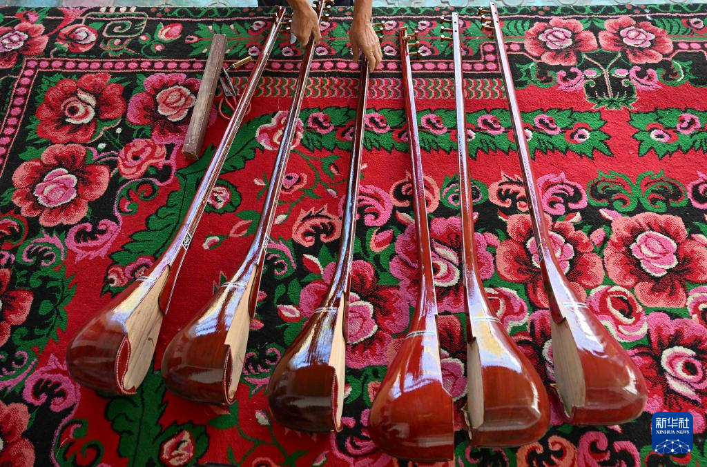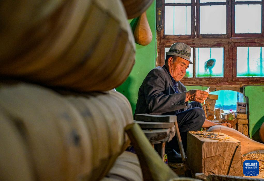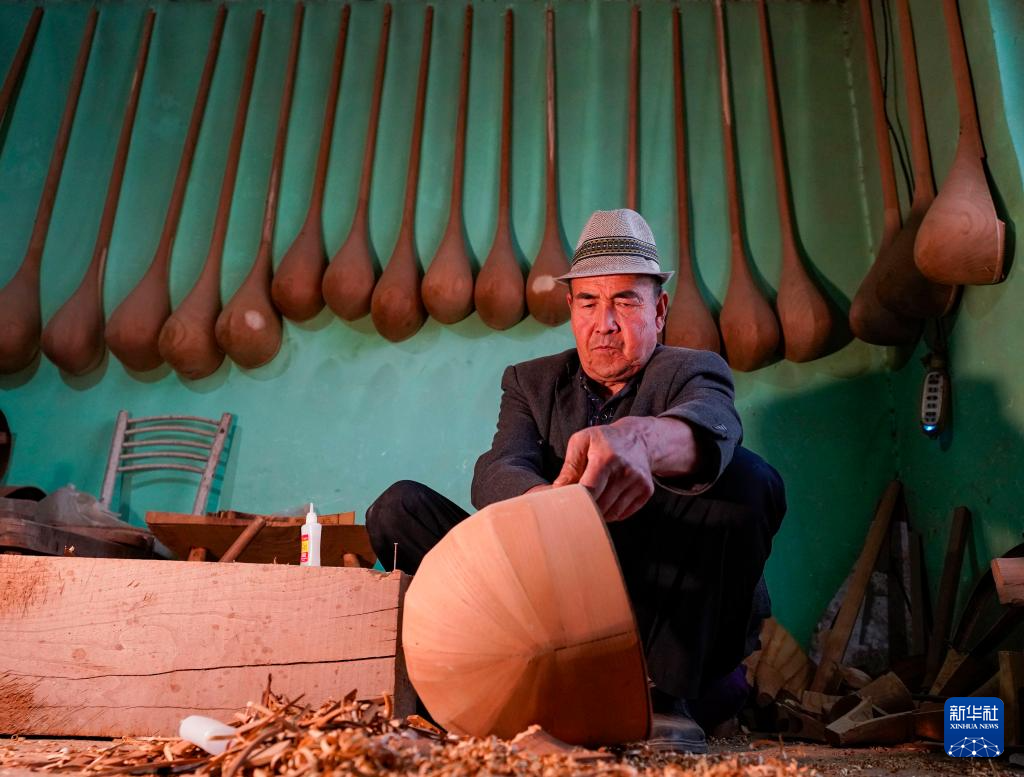 在努尔东看来,乐器制作不仅是技艺的展现,更是对优美声音的追求。历经多年磨练,努尔东熟悉挑选木材、拼接组装、刻花装饰、调漆上色、装弦定音等乐器制作的各个环节。桑木,这种新疆常见的木材,因其具有较好声学性能,成为努尔东等民间乐器制作人常用的材料。随着时代发展,努尔东的库房里还有购自其他省份和国外的木材,以满足客户的不同需要;父辈们常用的羊肠琴弦,如今也被尼龙线等材质替代;在数控设备等智能工具助力下,乐器上的花纹也更加复杂多样。