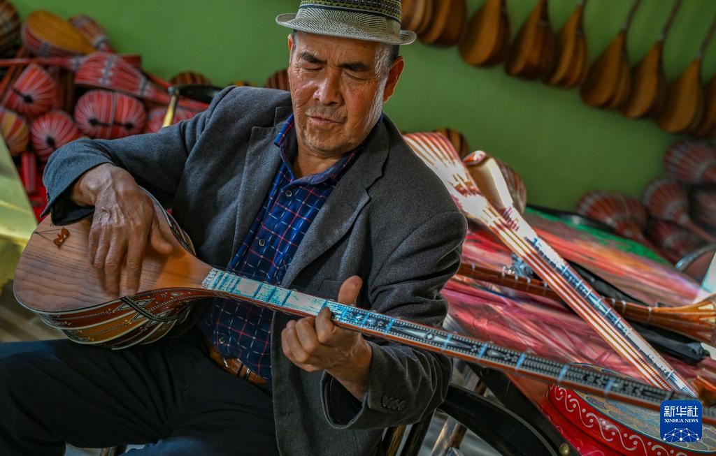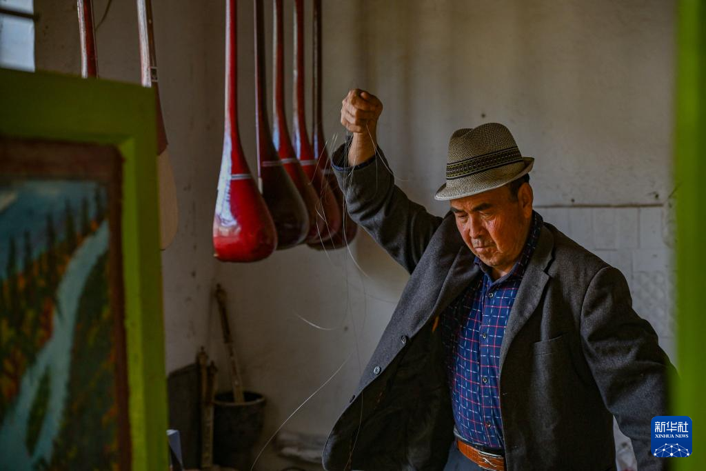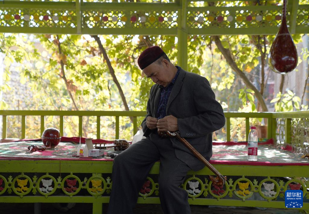 阳光洒进一个周围栽满桑树的小院,院中葡萄架下,光影斑驳。65岁的努尔东·司马义在家中忙碌,带着家人和徒弟手工制作传统乐器。