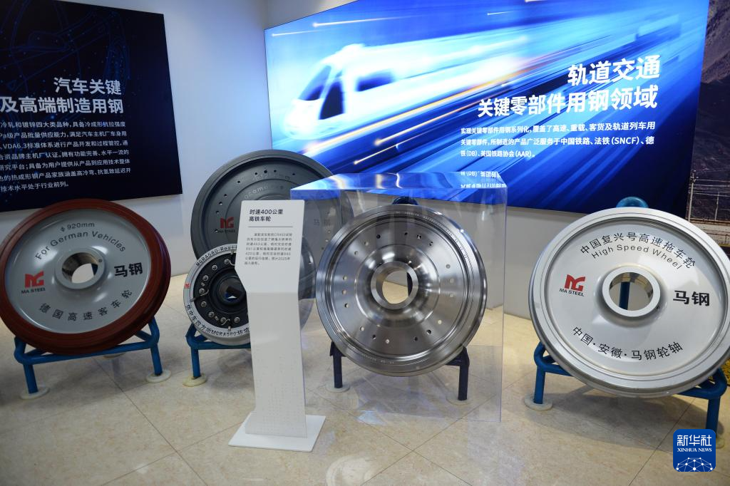 这是11月6日在宝武集团马钢展厅拍摄的车轮展品。