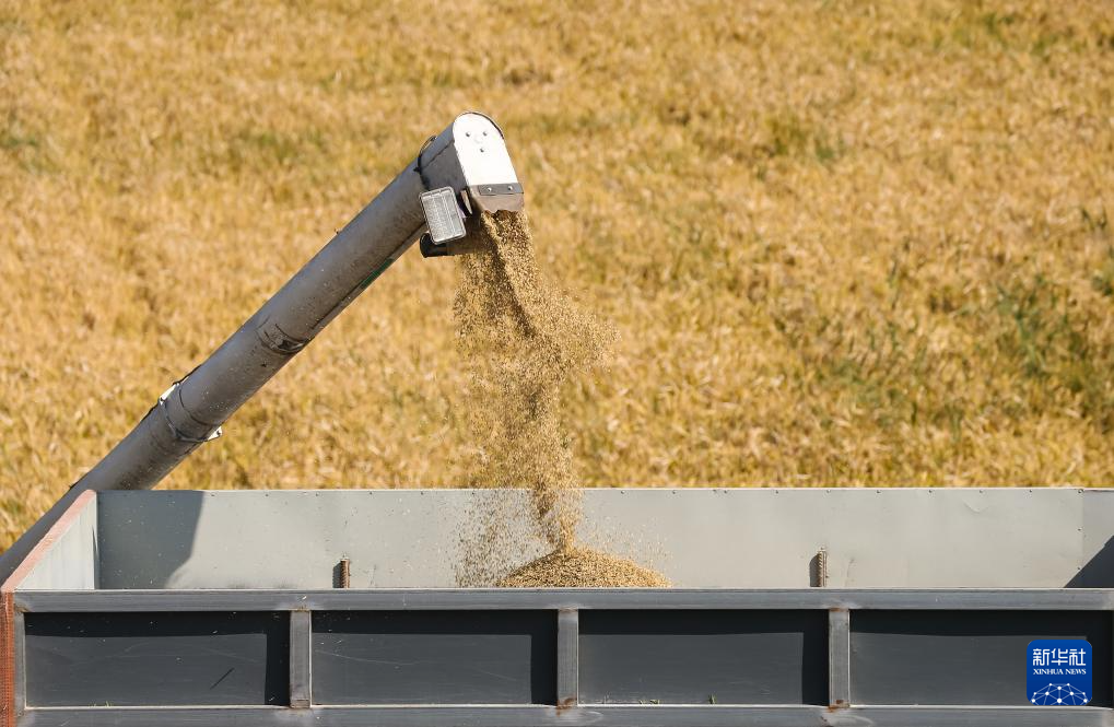 11月7日,在江苏省镇江句容市郭庄镇,水稻收割机将收割的水稻装车。
