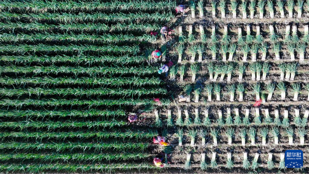 11月7日,河北省唐山市丰南区岔河镇杨义口头三村的农民在田间收获大葱(无人机照片)。