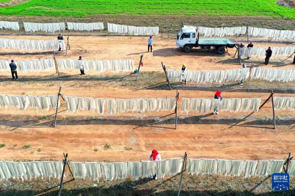 11月7日,山东省青岛市即墨区金口镇池戈庄甘薯粉条合作社的农民在晾晒粉条(无人机照片)。