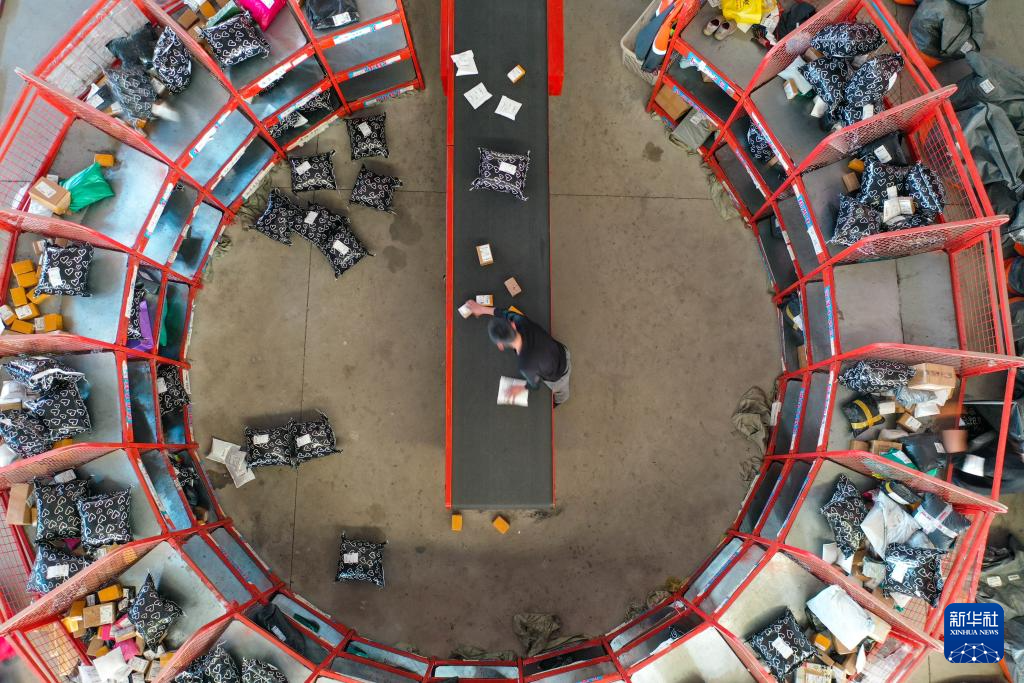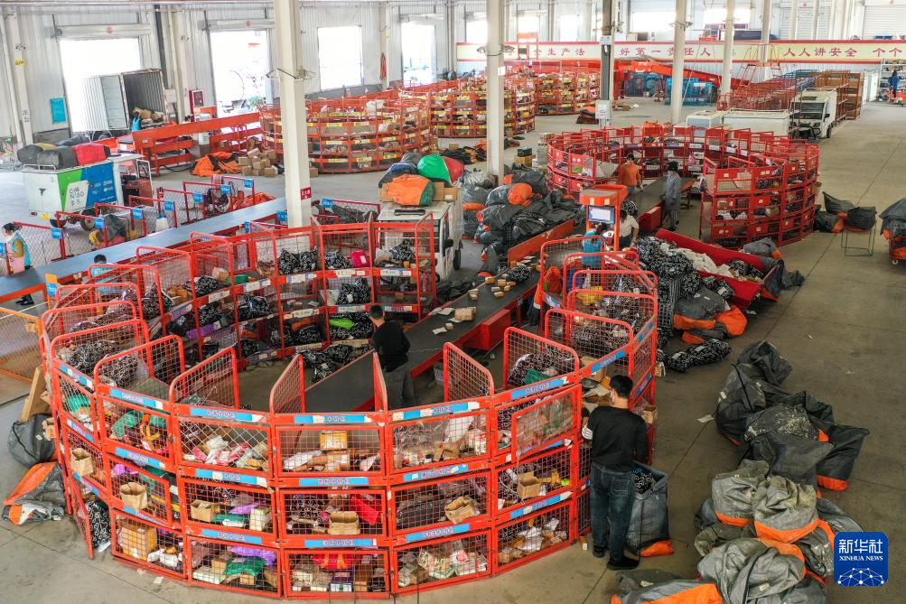 11月6日,工作人员在宁阳县菜鸟智慧物流园内分拣快递商品(无人机照片)。当地已建成县级物流中心3处,全县553个行政村全部建立快递站、便民服务站。