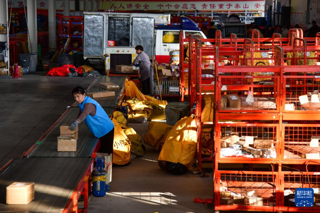 11月6日,工作人员在宁阳县菜鸟智慧物流园内分拣快递商品。