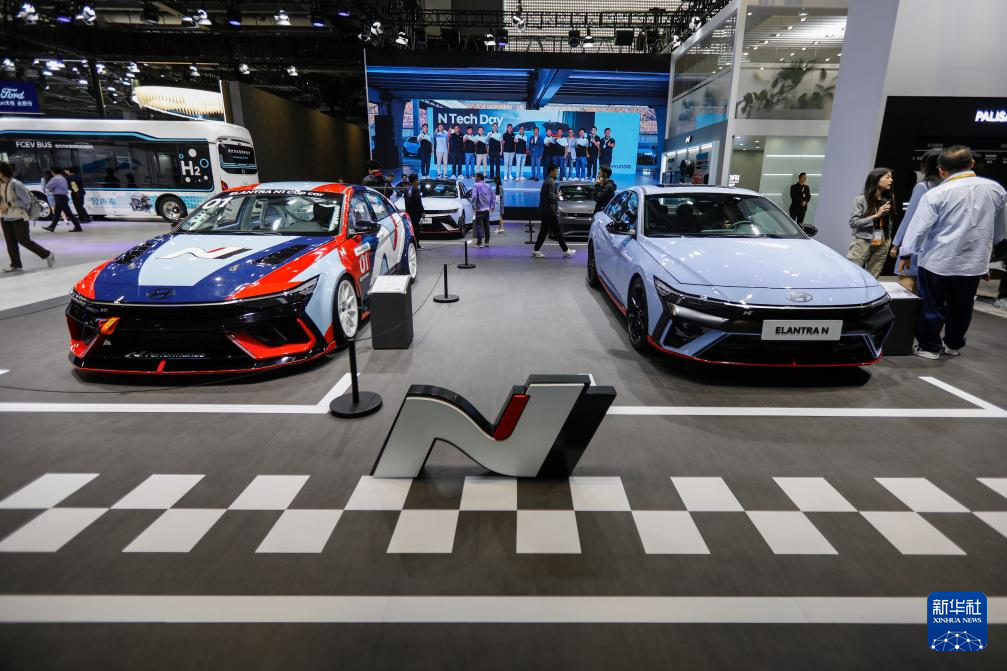 11月7日在第七届进博会汽车展区拍摄的现代2024全新ELANTRA N1统规赛赛车(左)和全新ELANTRA N车型。