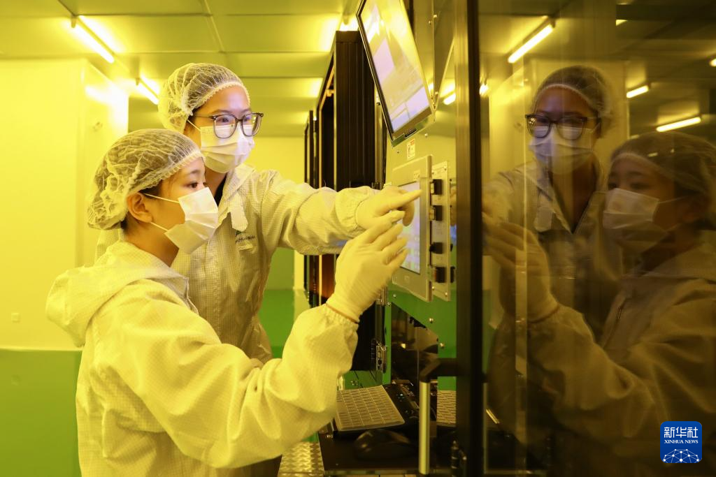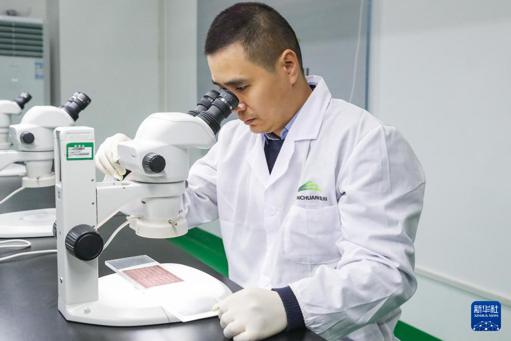 在甘肃省兰州新区甘肃金川兰新电子科技有限公司,技术人员通过电子显微镜检查该公司生产的集成电路蚀刻型引线框架的外观和尺寸(10月22日摄)。