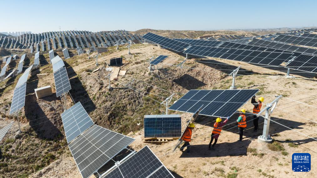 在中建二局承建的兰州新区城市智慧能源岛协同耦合项目工地上,工人安装光伏发电组件(无人机照片,10月22日摄)。