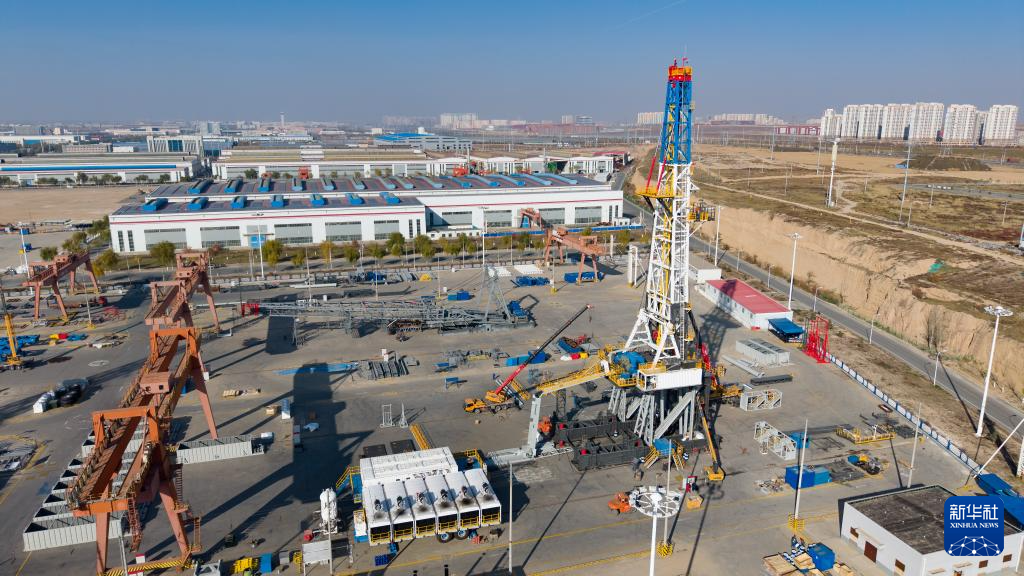 工人在兰州新区兰石集团高端装备产业园内调试一台即将出口的3000HP超深井沙漠快速移运钻机(无人机照片,11月6日摄)。