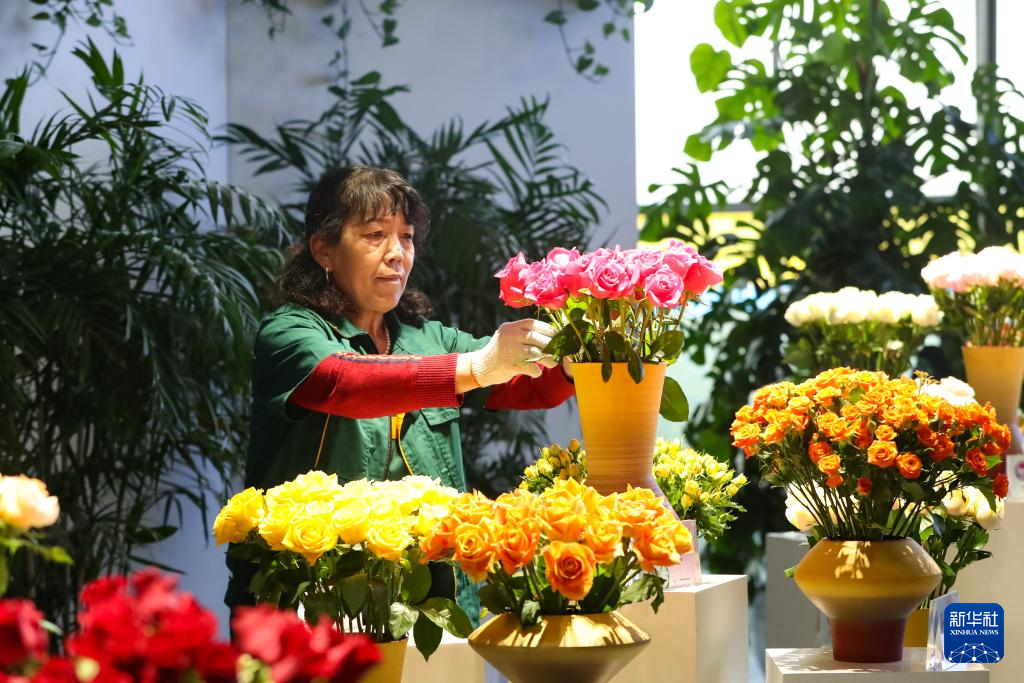 工人在兰州新区现代农业示范园花卉产业基地内插花(11月6日摄)。