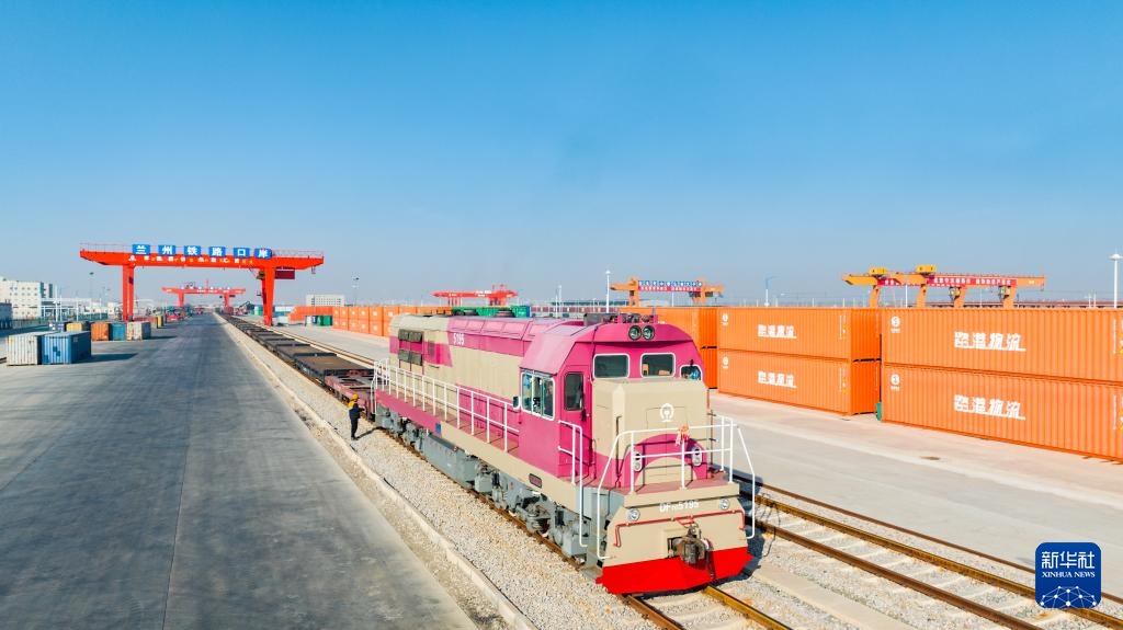 11月7日,一列货运列车驶入兰州新区中川北站物流园货运专用线准备装车作业(无人机照片)。